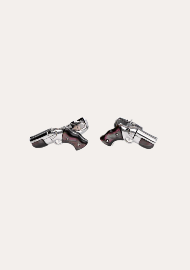 The Marksman cufflinks echo the precision of a classic revolver, crafted in polished metal with subtle mother-of-pearl detailing. A composed nod to discipline and focus.