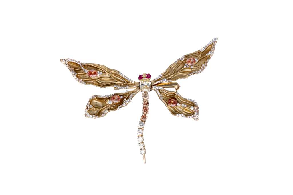 A Radiant Symbol of EleganceGracefully crafted from lightweight aluminum, Aurélia is a stunning golden dragonfly brooch adorned with shimmering crystals and faux yellow sapphires. Its intricately sculpted wings catch the light with a warm, golden glow, while its gem-studded body embodies brilliance and grace. A tribute to transformation and beauty, this luminous piece captures the essence of nature’s radiance in motion.