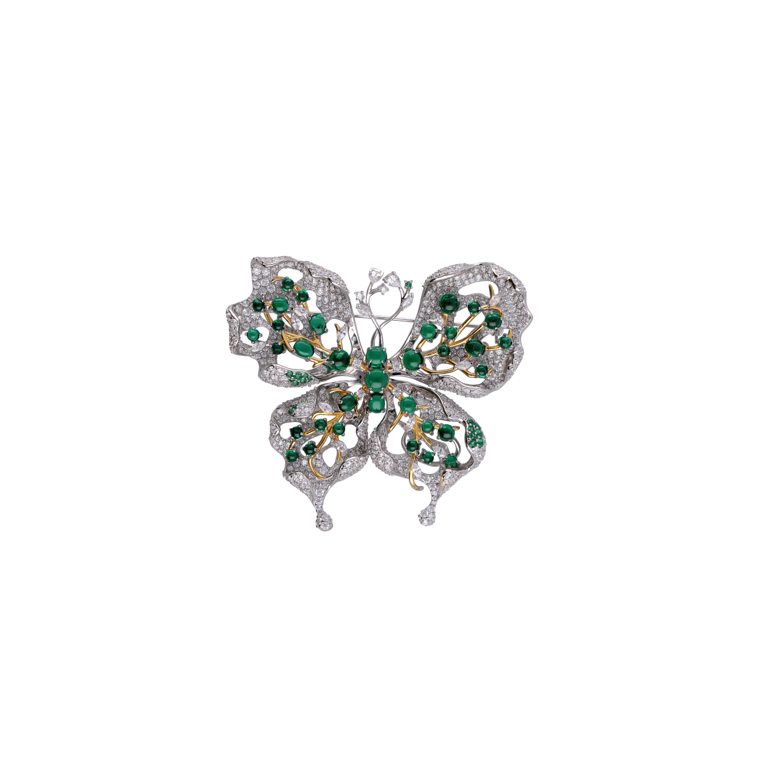 Wings of Renewal -Elysia is a captivating butterfly brooch, adorned with vibrant green emeralds and sparkling crystals. Its wings shimmer with shades of rich green, evoking the fresh beauty of nature. Symbolizing transformation and renewal, Elysia captures the grace of a butterfly in flight, embodying both elegance and strength in a timeless design.