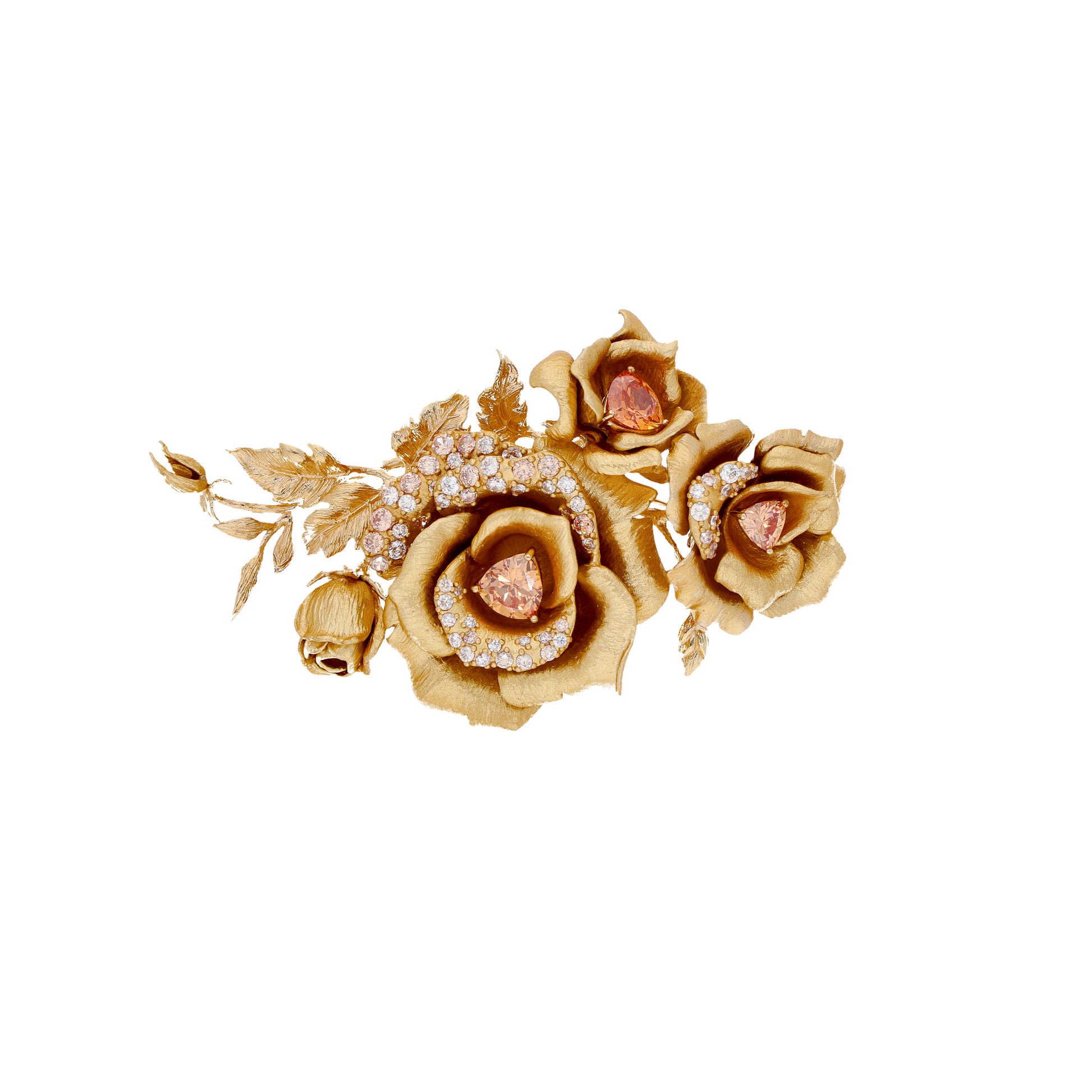 A Golden Emblem of Grace Gracefully crafted from lightweight aluminum, Orabella is a stunning golden rose brooch adorned with shimmering crystals. Its delicately sculpted petals glow with a warm, gilded radiance, while its jeweled center exudes brilliance and sophistication. A tribute to beauty and elegance, this luminous piece captures the timeless charm of nature’s most regal bloom.