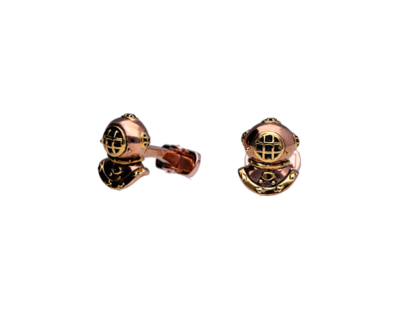 Meticulously detailed, this cufflink depicts a classic scuba diving helmet, a symbol of deep-sea adventure, exploration, and timeless maritime allure.